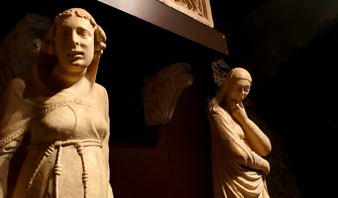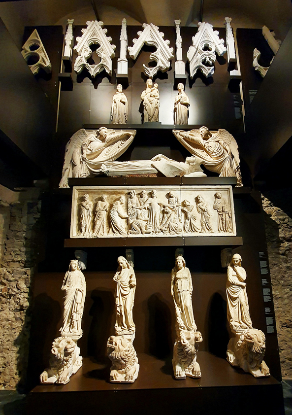 Genova, 18 giugno 2025. Sono nei pressi della splendida chiesa di San Matteo, che dà nome alla piazza, e mi dirigo verso uno dei più bei musei della città, il Museo Diocesano, in via Tommaso Reggio. Ricchissimo per le numerose e preziose opere d’arte contenute, è poco noto ai non genovesi, mentre si tratta di un autentico gioiello, da scoprire visitando la città che tanto amo. A partire dal magnifico chiostro della fine del XII secolo, quando qui risiedevano i Canonici della Cattedrale, San Lorenzo, per arrivare al polittico di San Bartolomeo (secolo XIV) di Barnaba da Modena e agli incredibili cinquecenteschi teli blu, che in un tessuto identico al jeans vedono mirabilmente rappresentata la Passione di Cristo. Questo luogo che raccoglie un significativo patrimonio di opere d’arte è carico di sorprese, ma il gioiello forse splendente occupa l’intera parete di una stanza e la illumina con le elegantissime opere di marmo bianco apuano. Figure diverse realizzate dai medesimi artisti compongono un insieme unico, che tenta di ricostruire quella che forse in origine era la Cappella Fieschi, nata per volontà del giovane cardinale Luca e collocata nella cattedrale, per costituirne il monumento funebre. Lui che amava l’arte ed era committente e collezionista di opere volle, per ospitare i suoi resti, un’opera grandiosa. Fu il primo sepolcro collocato in San Lorenzo, famoso per la sua magnificenza. Quando la cattedrale venne restaurata le parti architettoniche furono trasferite nel museo Sant’Agostino e infine, nel 1991, nella sede attuale.